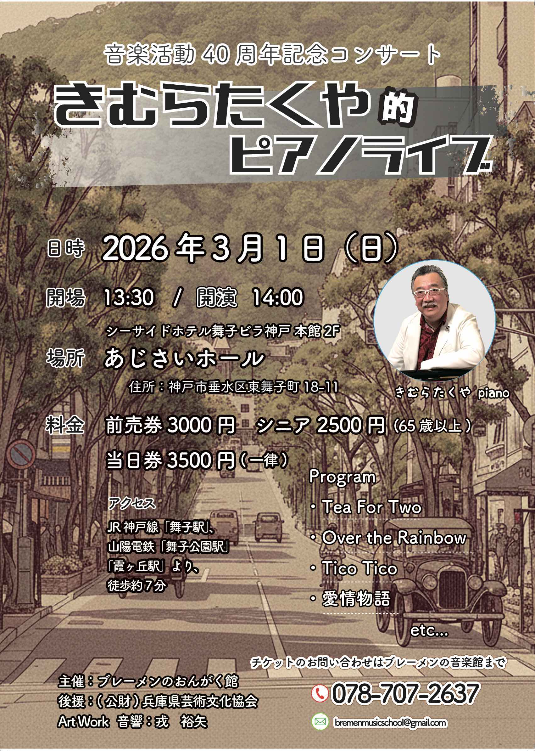 ブレーメンの最新情報お知らせ 2026年3月1日 日曜日 音楽活動40周年記念コンサート きむらたくや的ピアノライブ 場所…シーサイドホテル舞子ビラ神戸 あじさいホール